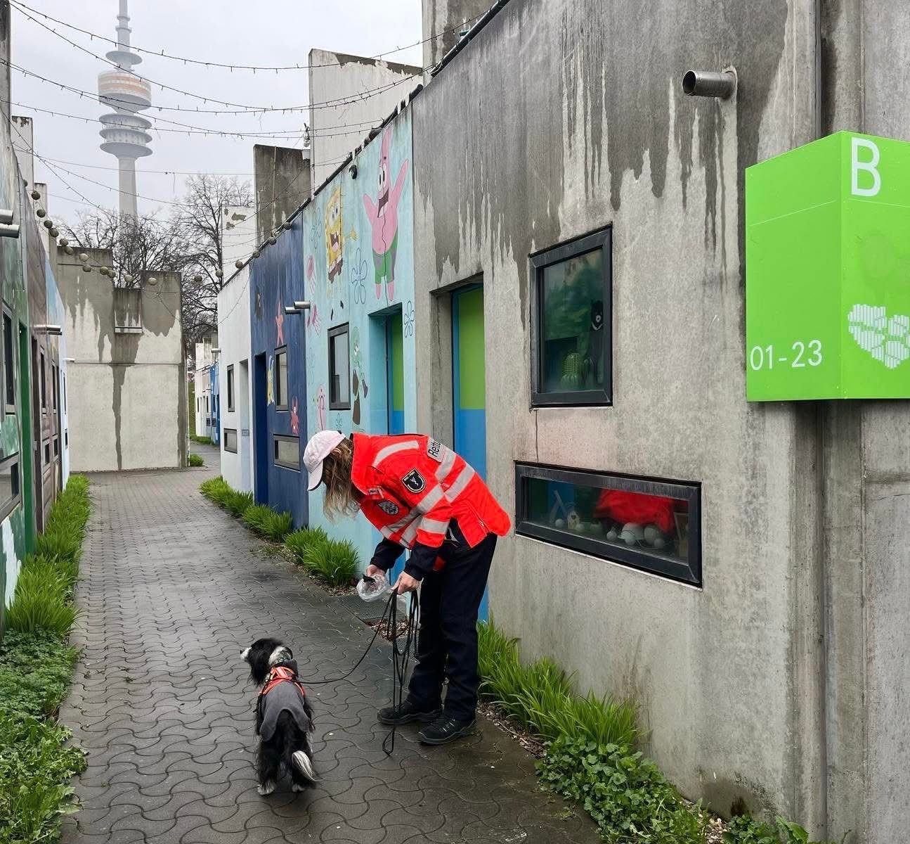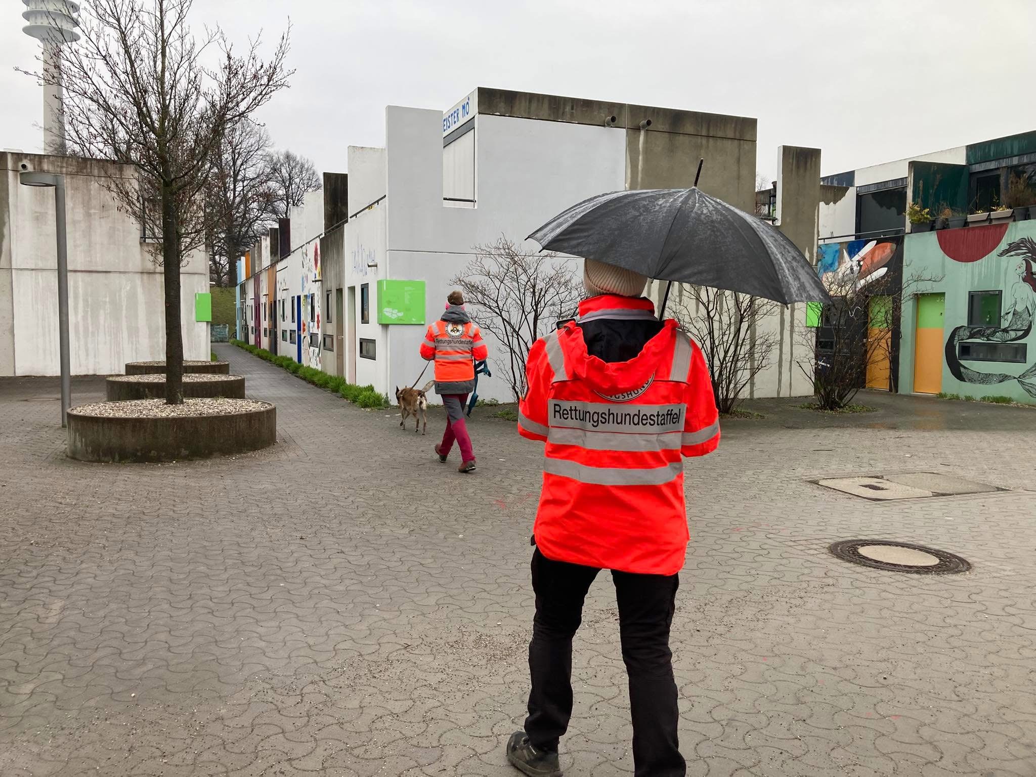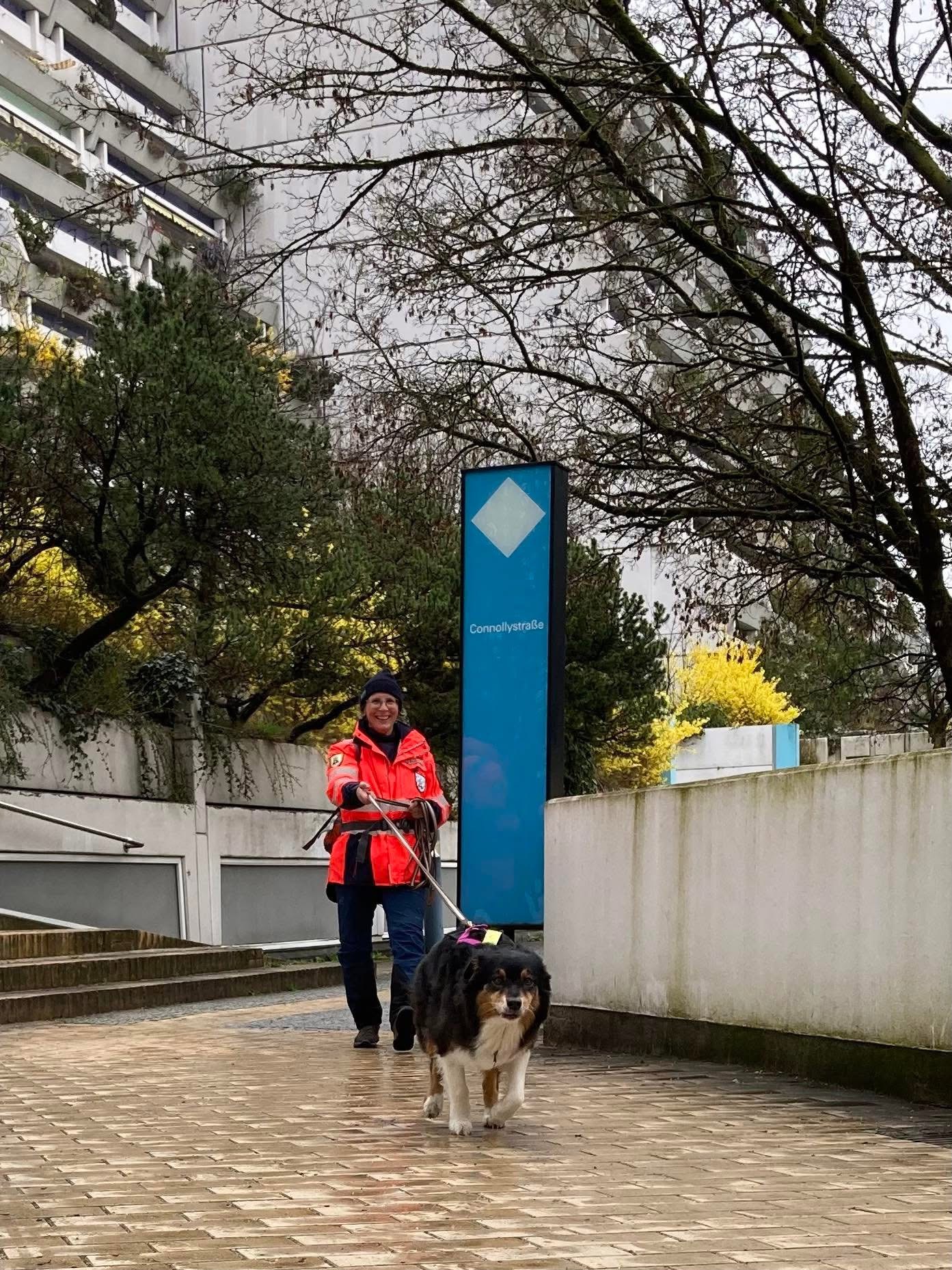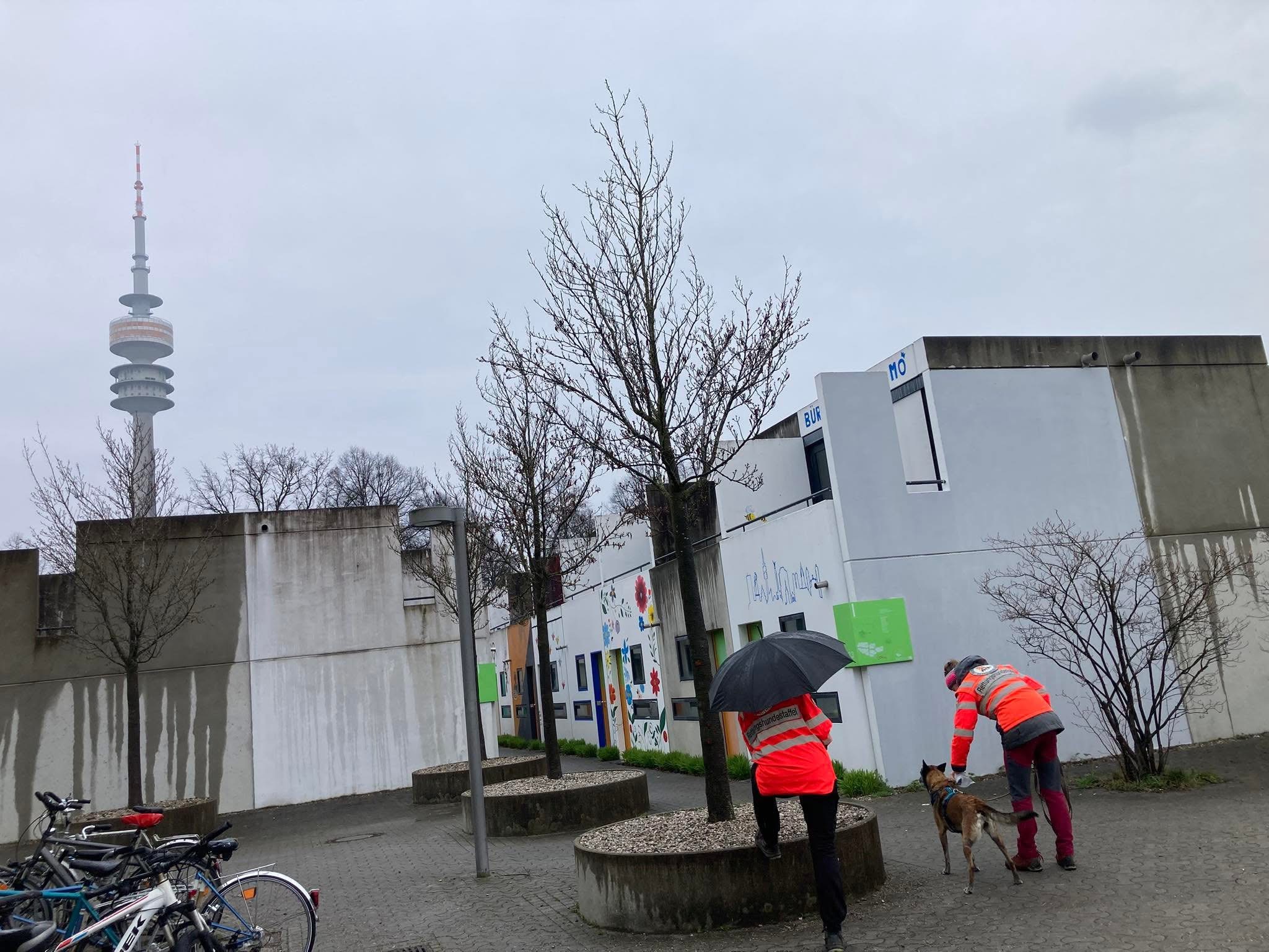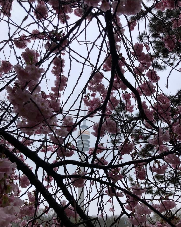 Mantrailing-Training Ende März bei Regen, unter den blühenden Kirschbäumen im Olympia Dorf und Olympia Park in München. 🌸